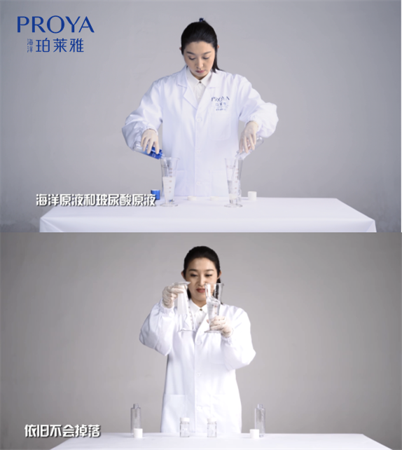 在渗透性测试中,将同等毫升量的海洋原液和网红保湿成分玻尿酸原液倒入等量的吸水柔珠中,3分钟后,海洋原液完全被吸水柔珠吸收,呈现出固态;而玻尿酸原液则不能完全被吸收,仍是液态。实验证明,经过冷发酵工艺使得营养小分子化的海洋原液渗透性更强,嗖的一下,高效快速地将水分传送直达肌底。